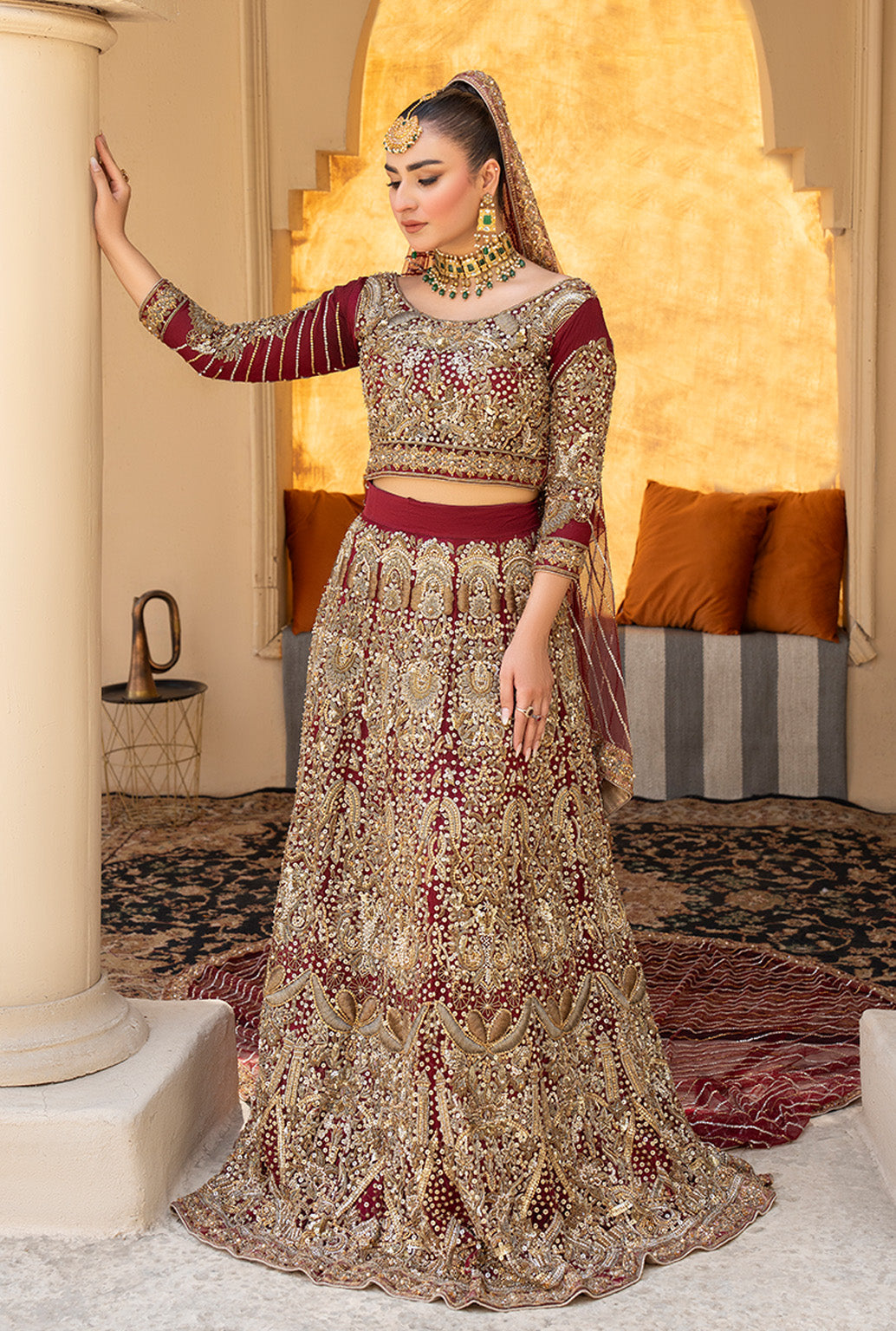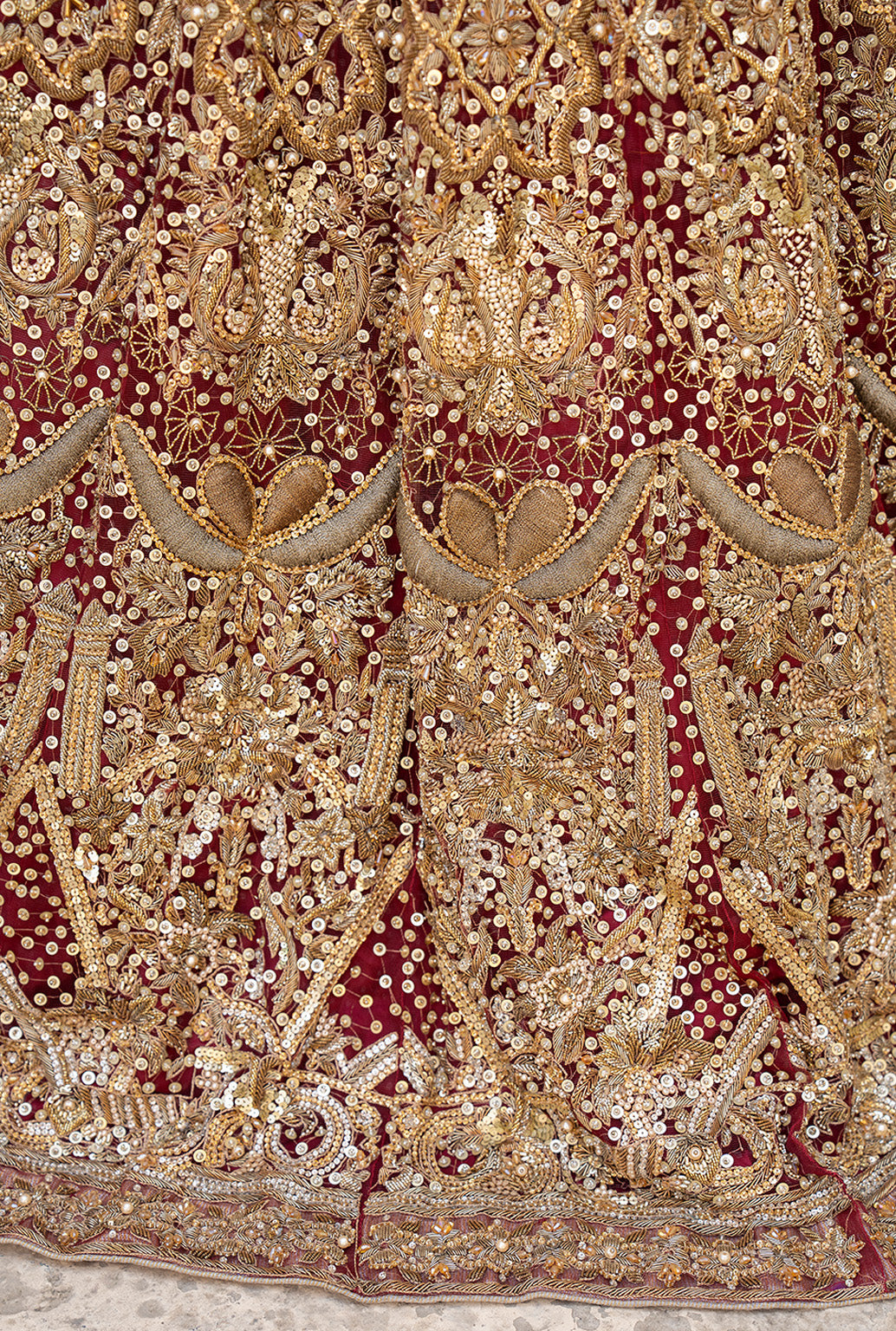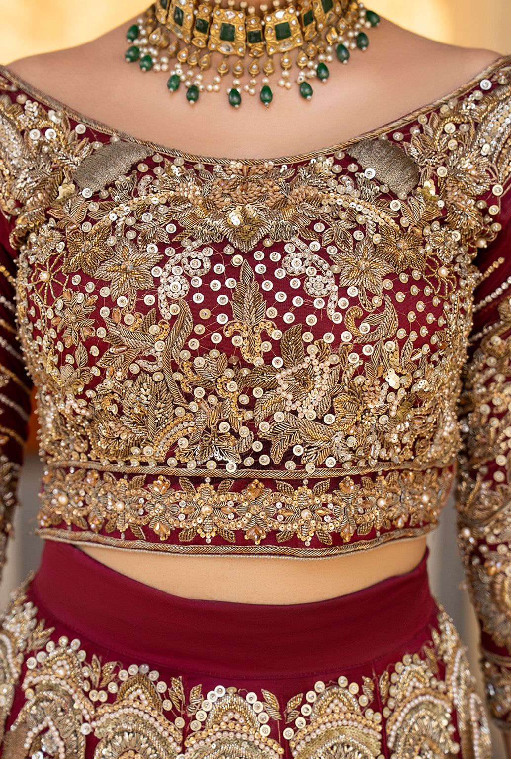 Description: This Exquisite Bridal Ensemble Features A Deep Crimson Red Base Adorned With Intricate Antique Gold Hand Embroidery, Mirror Work, And Sequin Detailing. The A-Line Lehenga Is Paired With A Fully Embellished Blouse Featuring Long Sleeves And A Classic Neckline, Blending Traditional Charm With Modern Elegance. Rich In Zardozi, Dabka, And Resham Craftsmanship, This Outfit Is A Timeless Choice For A Regal Bridal Look. With Hand Embrioded Long Tail Dupatta.