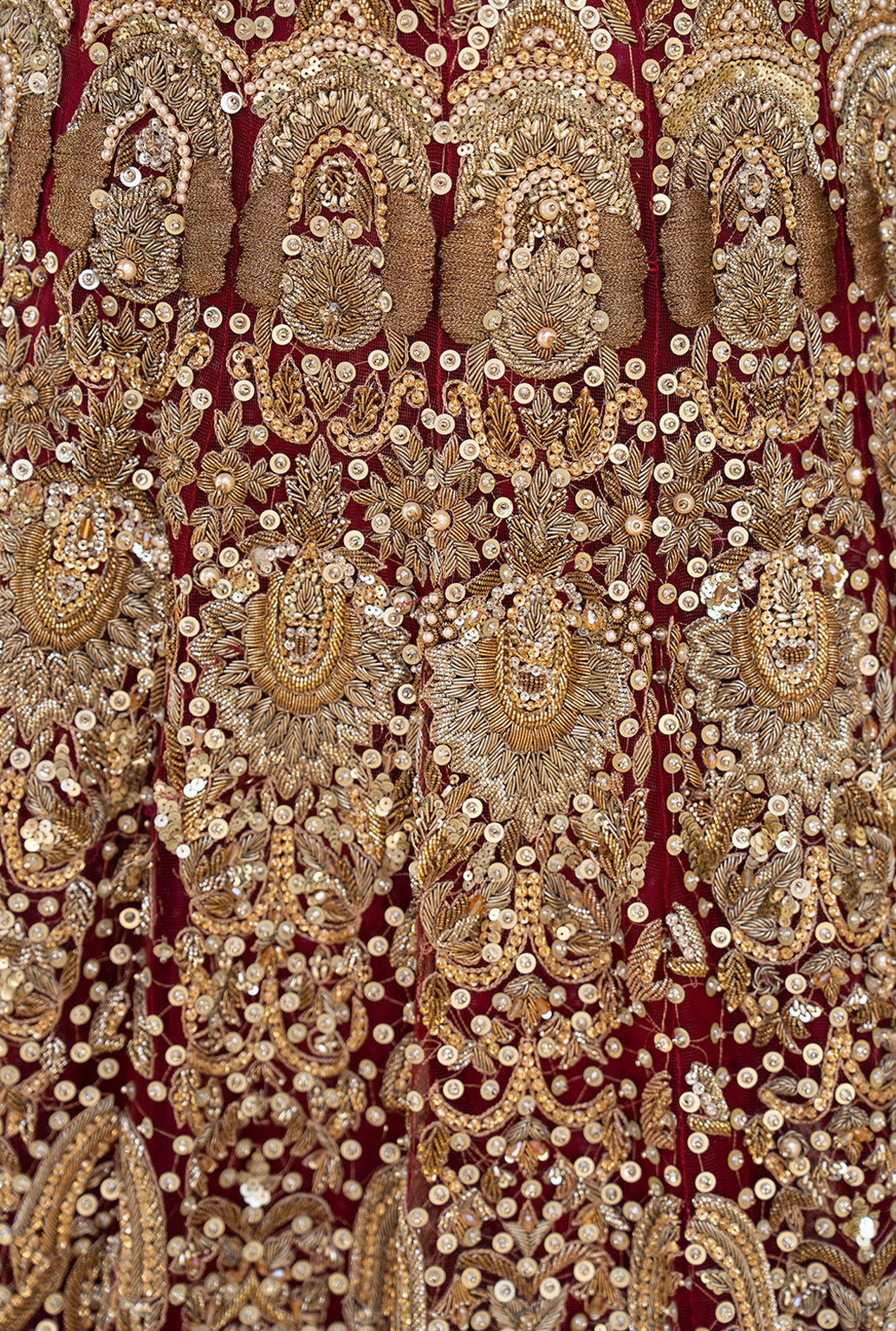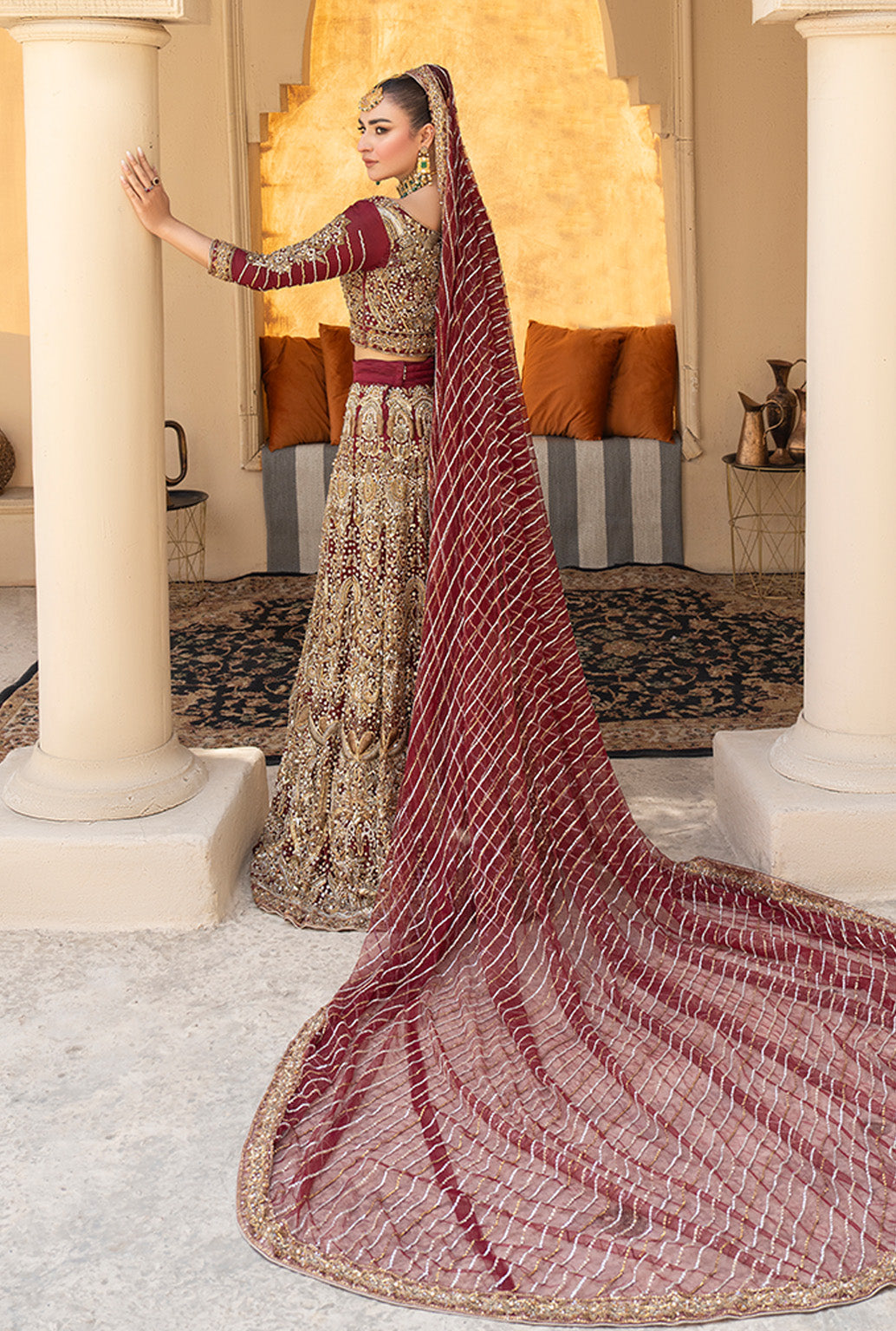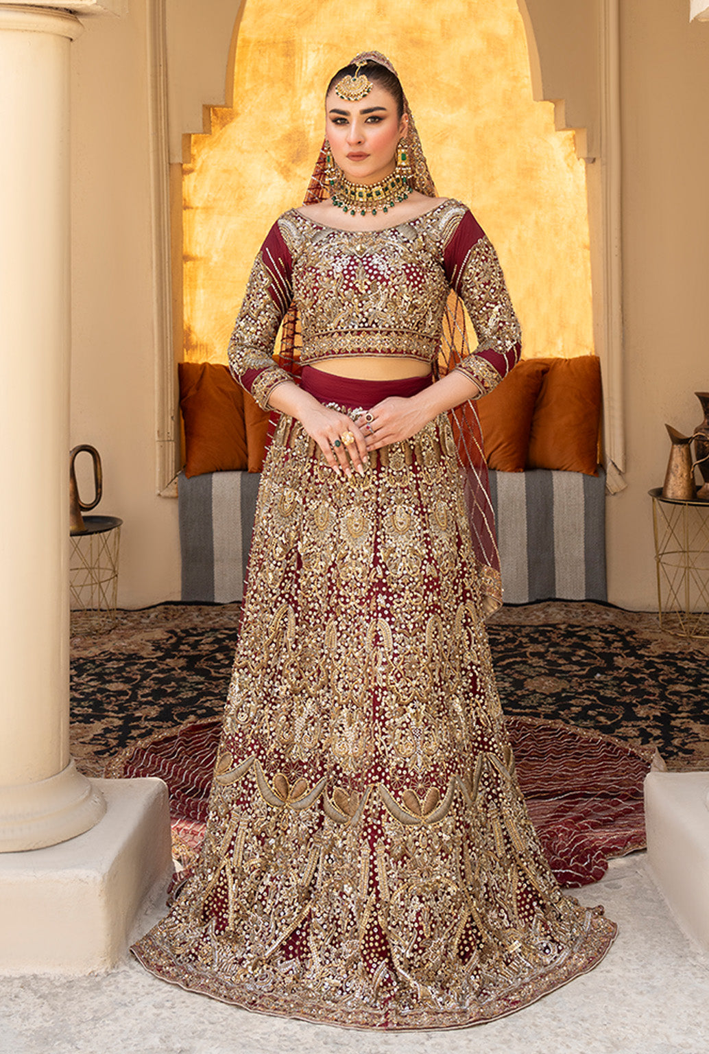 Description: This Exquisite Bridal Ensemble Features A Deep Crimson Red Base Adorned With Intricate Antique Gold Hand Embroidery, Mirror Work, And Sequin Detailing. The A-Line Lehenga Is Paired With A Fully Embellished Blouse Featuring Long Sleeves And A Classic Neckline, Blending Traditional Charm With Modern Elegance. Rich In Zardozi, Dabka, And Resham Craftsmanship, This Outfit Is A Timeless Choice For A Regal Bridal Look. With Hand Embrioded Long Tail Dupatta.