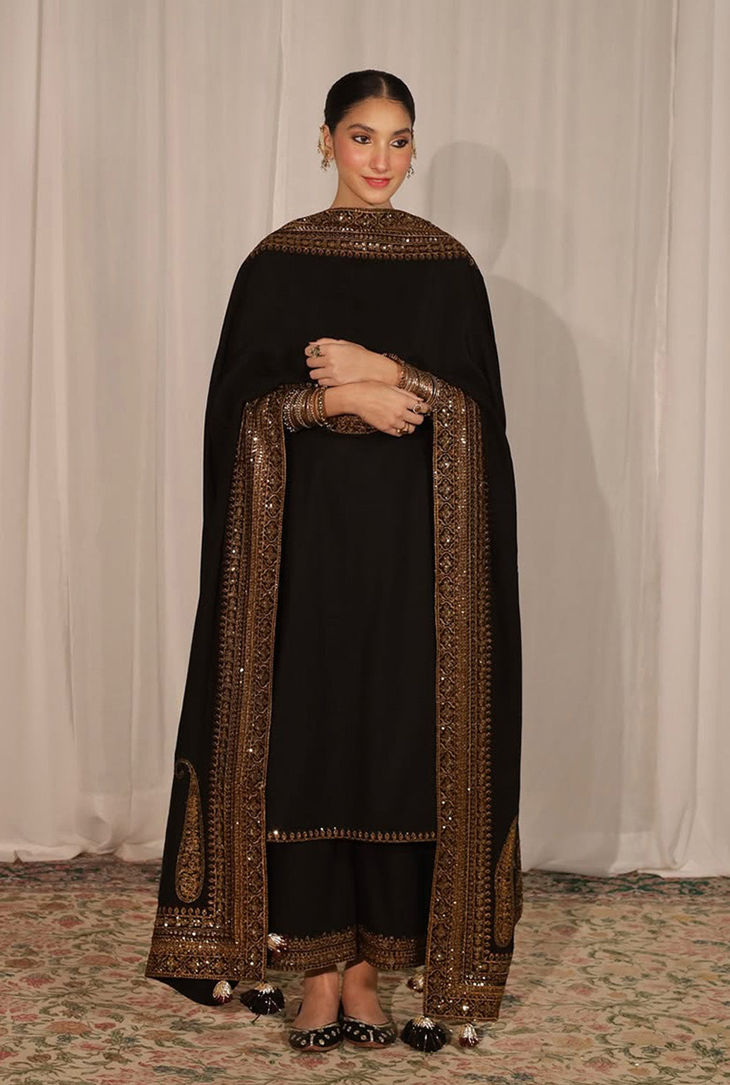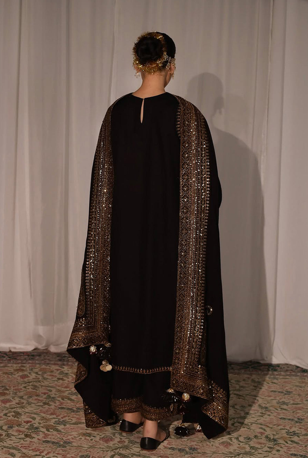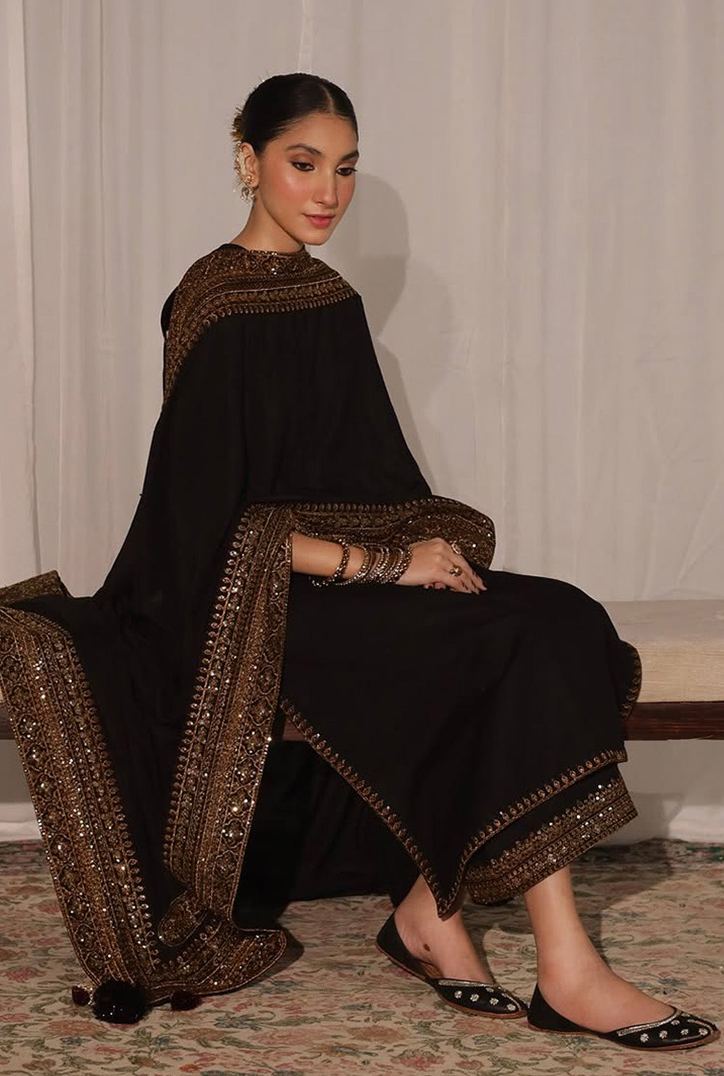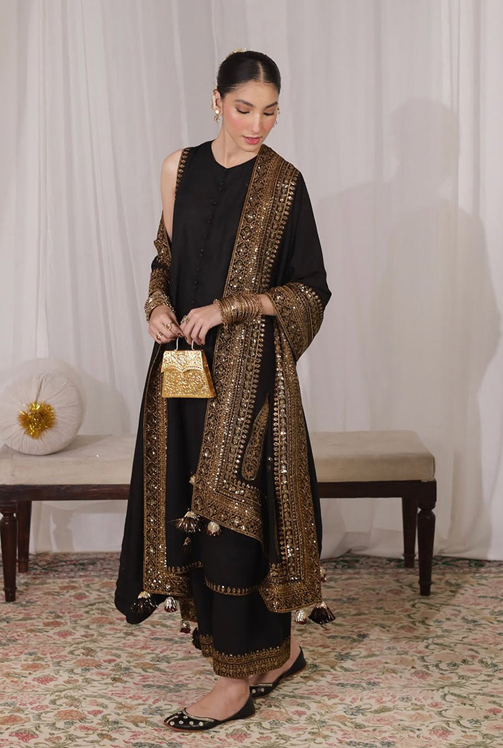This luxurious black three-piece outfit is a celebration of traditional craftsmanship and timeless elegance. The ensemble features a straight-cut shirt made from rich, flowy fabric that drapes gracefully on the body. The neckline, sleeves, and hemline are adorned with intricate antique gold embroidery, enhanced with fine sequins and mirror work that add a subtle shimmer.Paired with wide-leg trousers that are delicately finished with matching embroidered borders, the silhouette offers both comfort and grandeur. The highlight of this ensemble is the heavily embellished dupatta, featuring ornate borders, motif detailing, and handcrafted tassels at the edges —creating a regal, eye-catching appeal.
