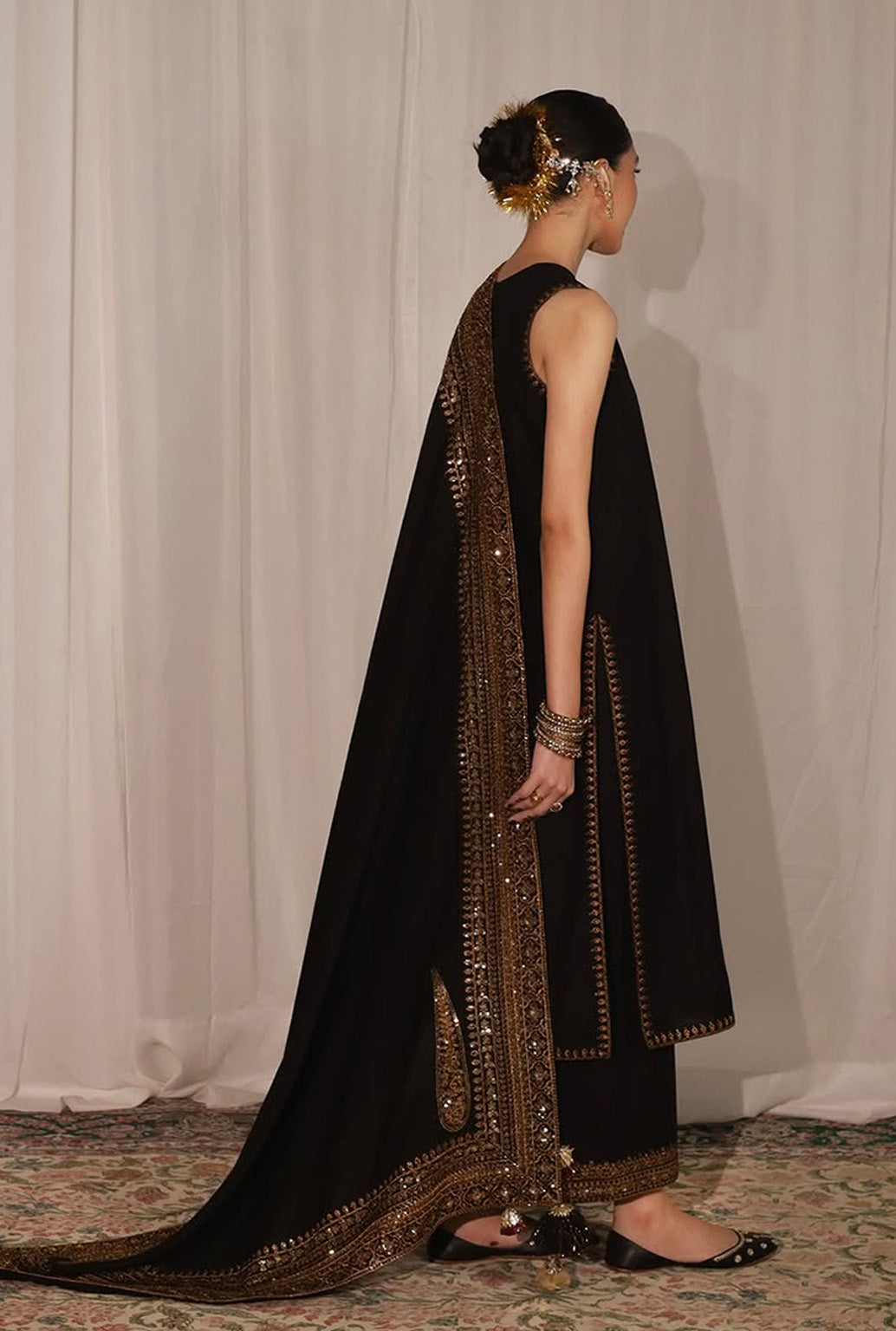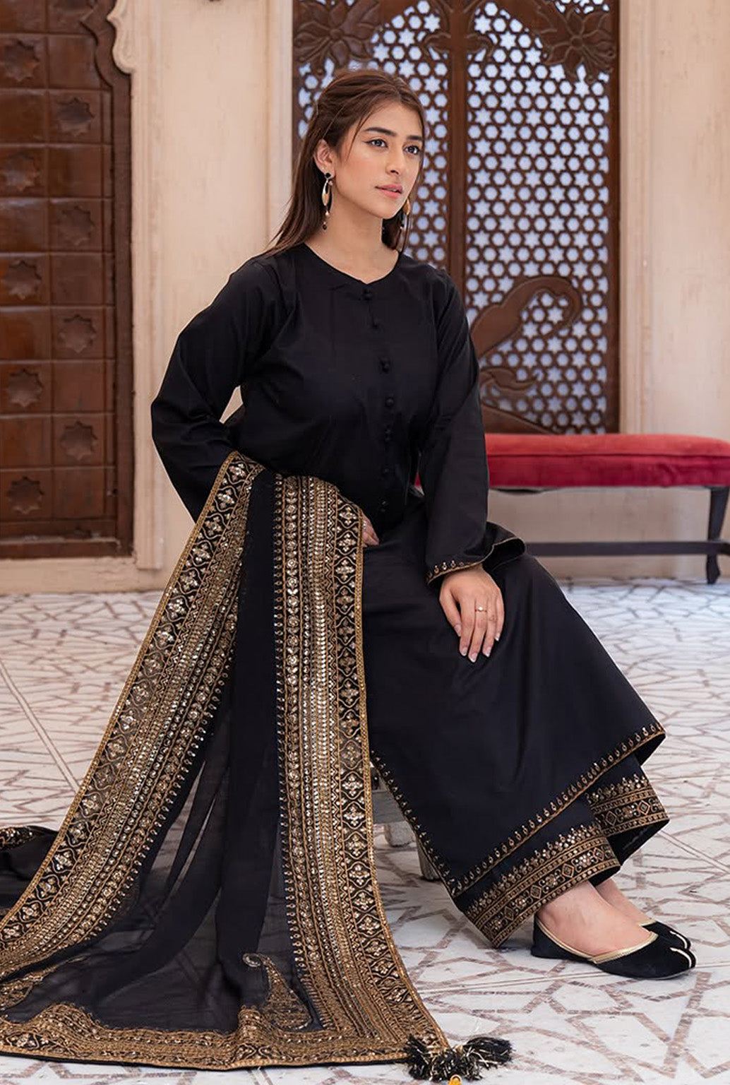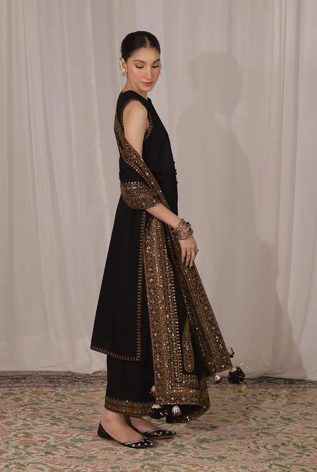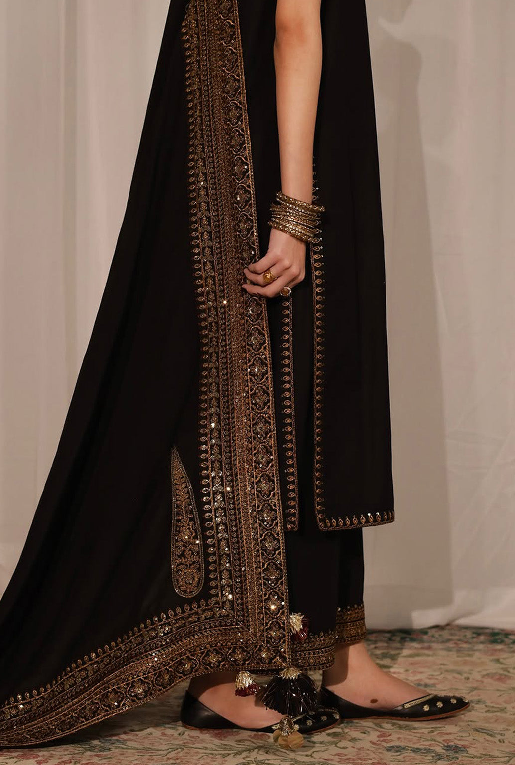 This luxurious black three-piece outfit is a celebration of traditional craftsmanship and timeless elegance. The ensemble features a straight-cut shirt made from rich, flowy fabric that drapes gracefully on the body. The neckline, sleeves, and hemline are adorned with intricate antique gold embroidery, enhanced with fine sequins and mirror work that add a subtle shimmer.Paired with wide-leg trousers that are delicately finished with matching embroidered borders, the silhouette offers both comfort and grandeur. The highlight of this ensemble is the heavily embellished dupatta, featuring ornate borders, motif detailing, and handcrafted tassels at the edges —creating a regal, eye-catching appeal.