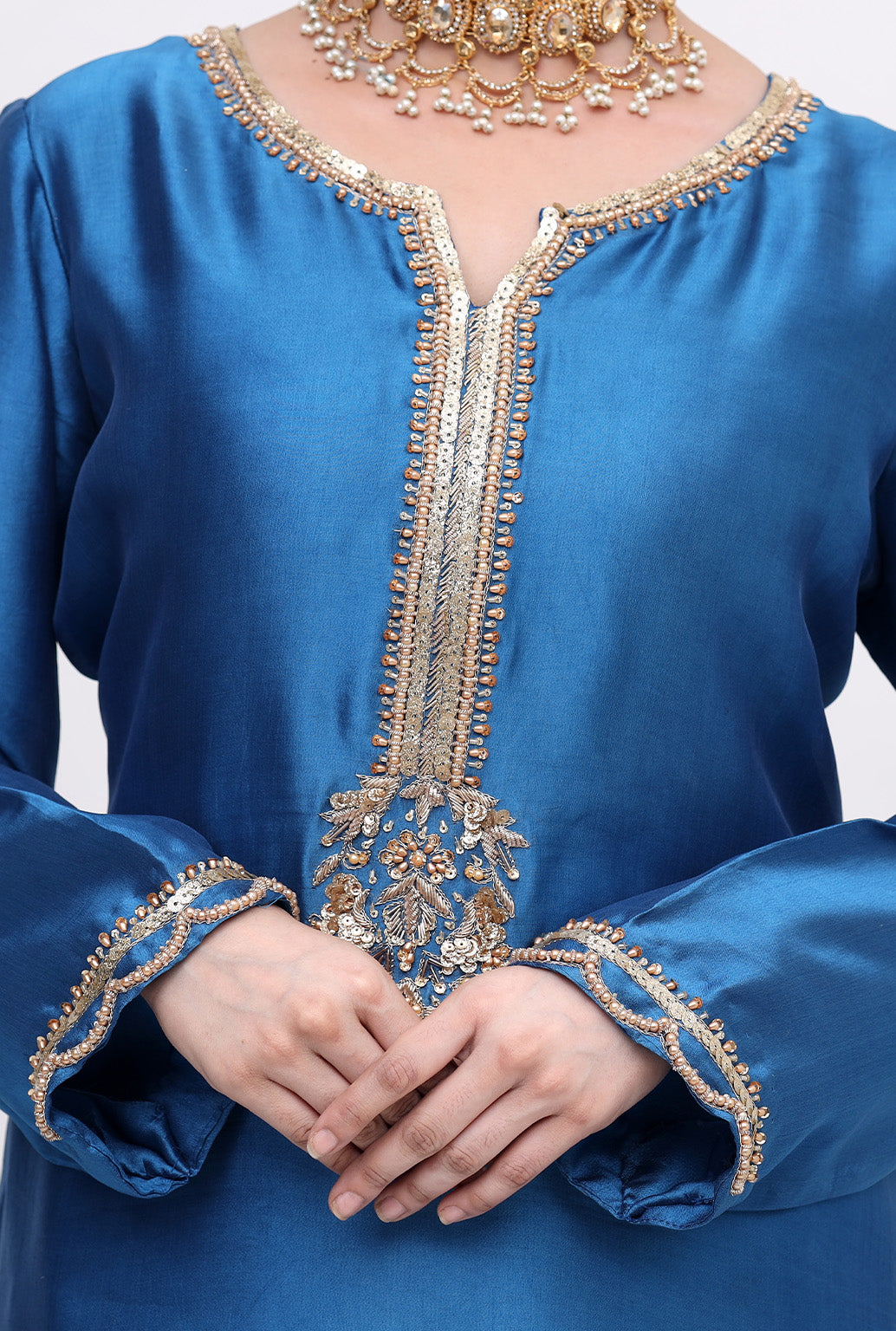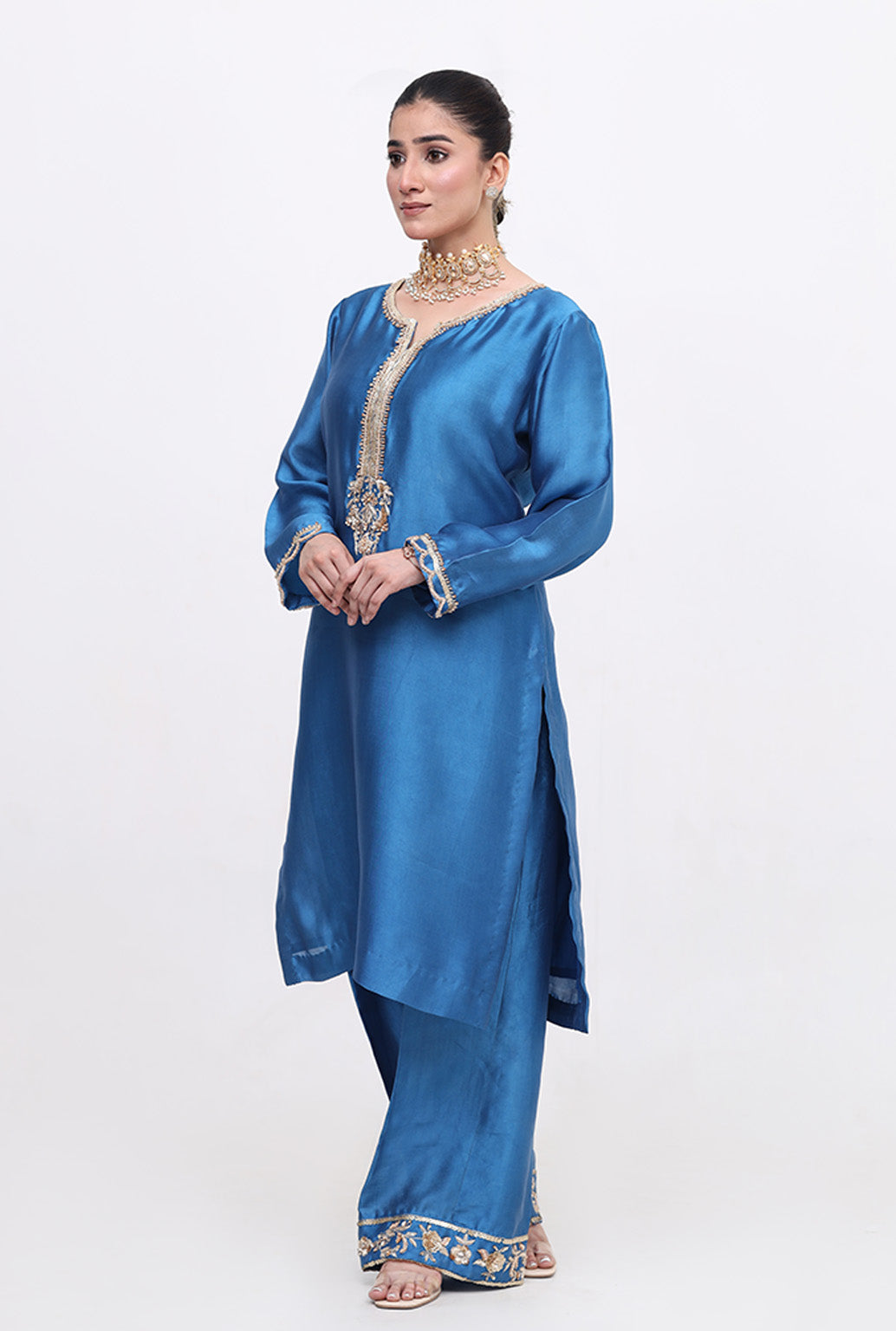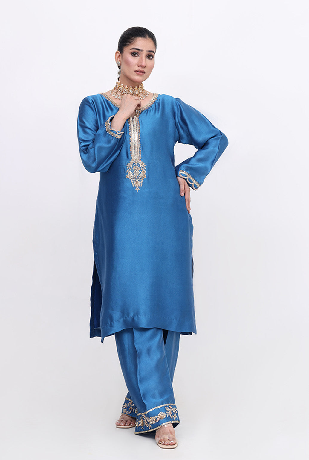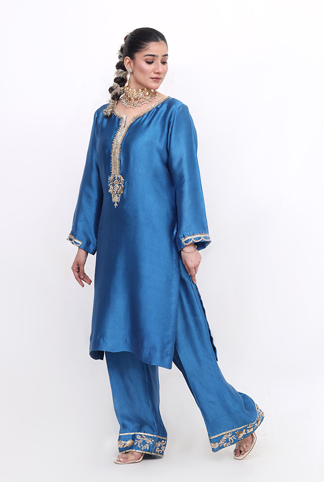 Description : Elevate Your Festive Wardrobe With Azure Blue Color Semi Formal Dress A Stunning Shisha Silk Ensemble In A Rich, Deep Blue Hue. This Straight-Cut Kurta Features Delicate Hand Embroidery Around The Neckline, Sleeves, And Trouser Hem In Subtle Antique Kora Dabka Work Gold Shine Tones. The Luxurious Silk Fabric Drapes Beautifully, Offering Both Grace And Comfort. Paired With Wide-Leg Embroidered Trousers, This Outfit Blends Tradition With Modern Sophistication — Perfect For Festive Occasions, Dinners, Or Intimate Celebrations..