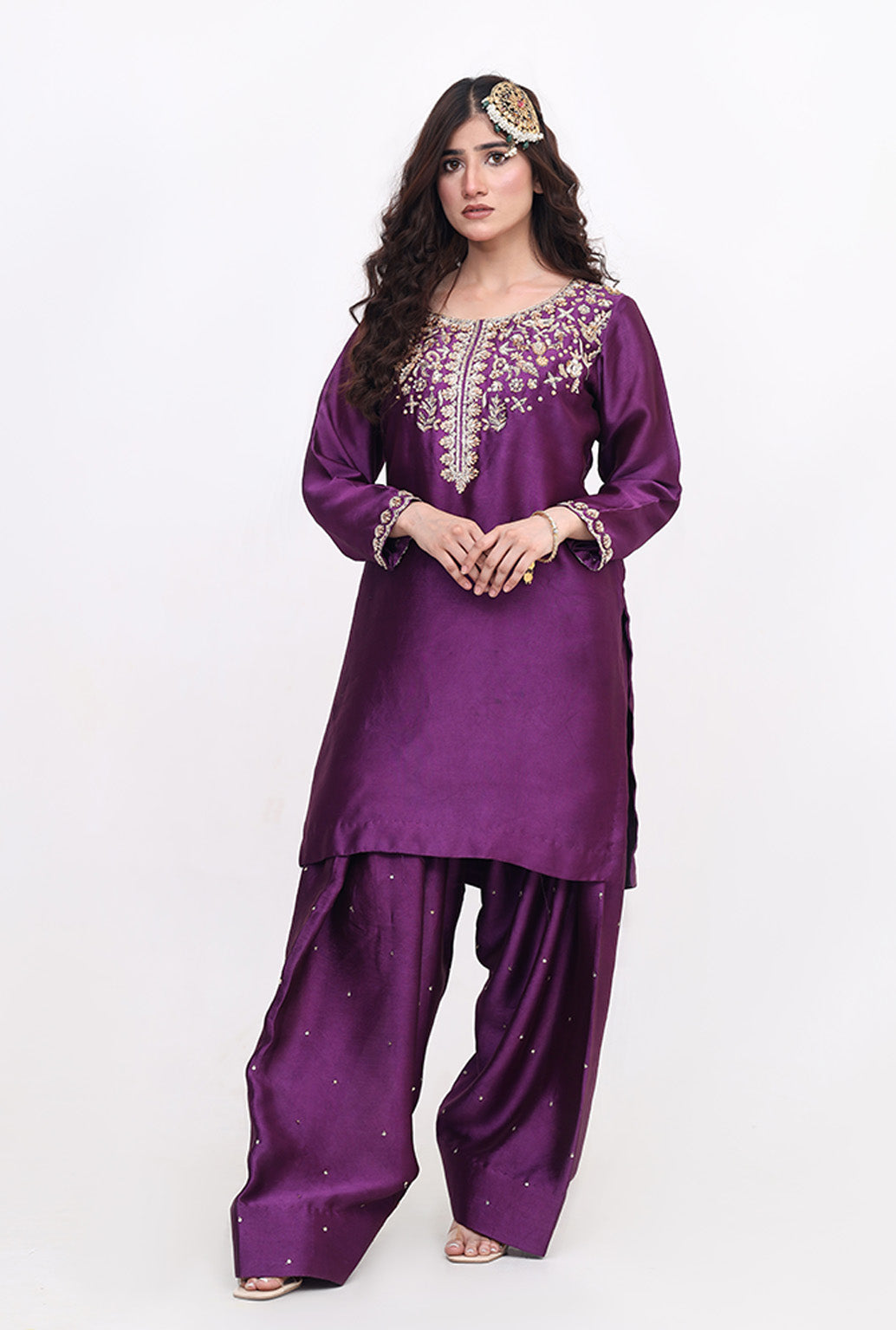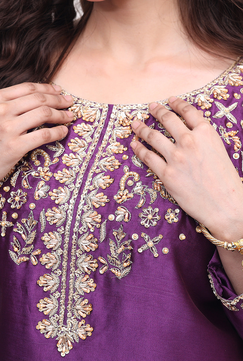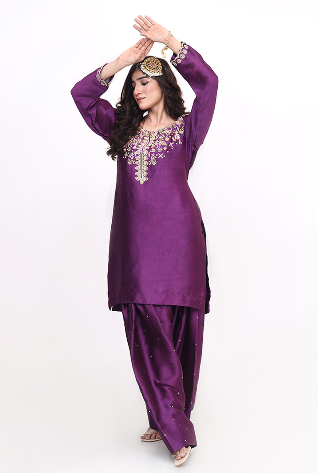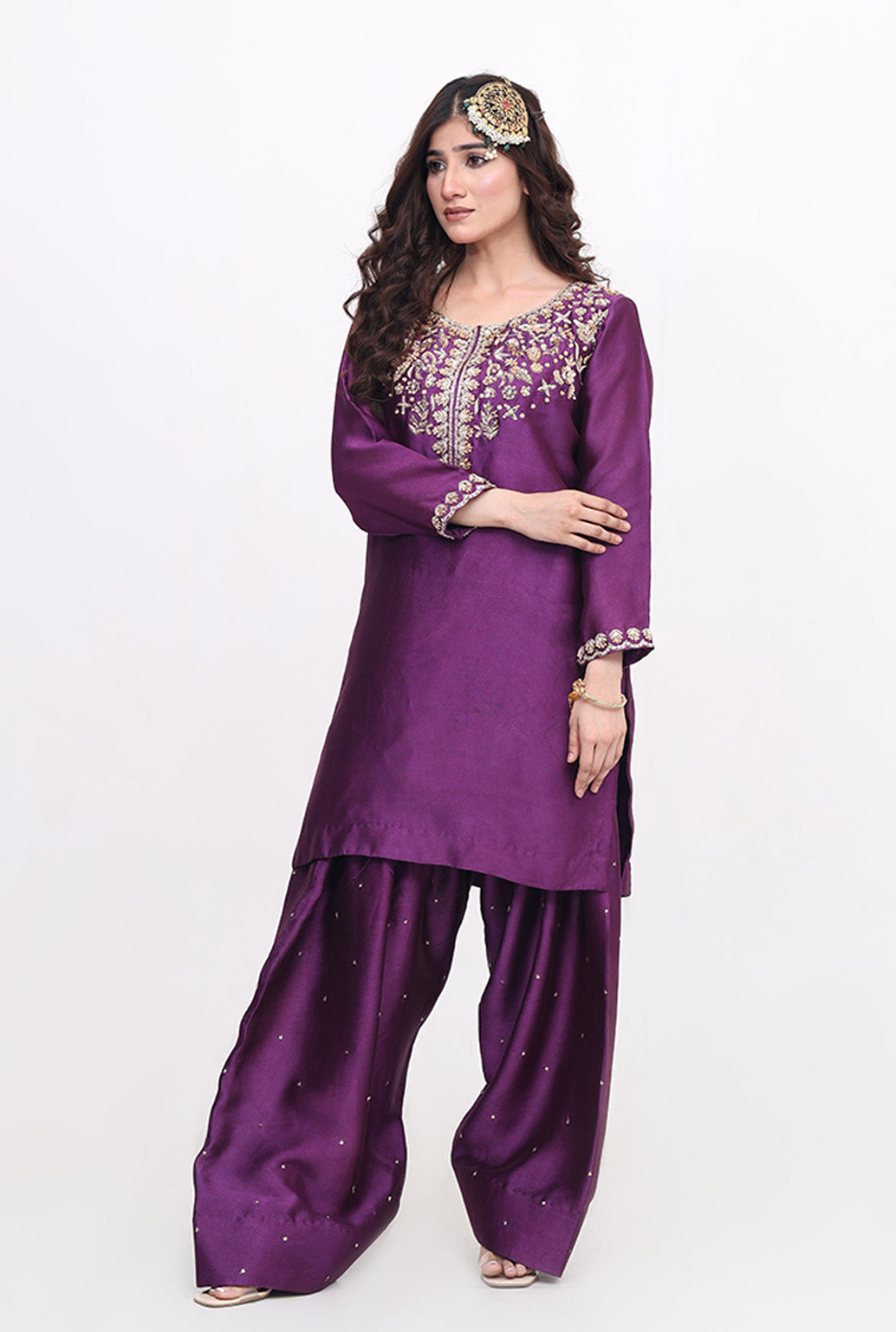 Description : An Elegant Deep Purple Ensemble Crafted On Premium Shisha Silk The Shirt Features Intricate Hand Embroidery In Antique Gold Along The Neckline And Sleeves, Adding A Graceful, Regal Touch. The Relaxed Silhouette Is Paired With Wide-Legged, Flared Trousers Adorned With Delicate Sequin Embellishments For A Subtle Shimmer. This Outfit Beautifully Blends Tradition With Contemporary Style, Making It A Perfect Choice For Festive And Semi-Formal Occasions.