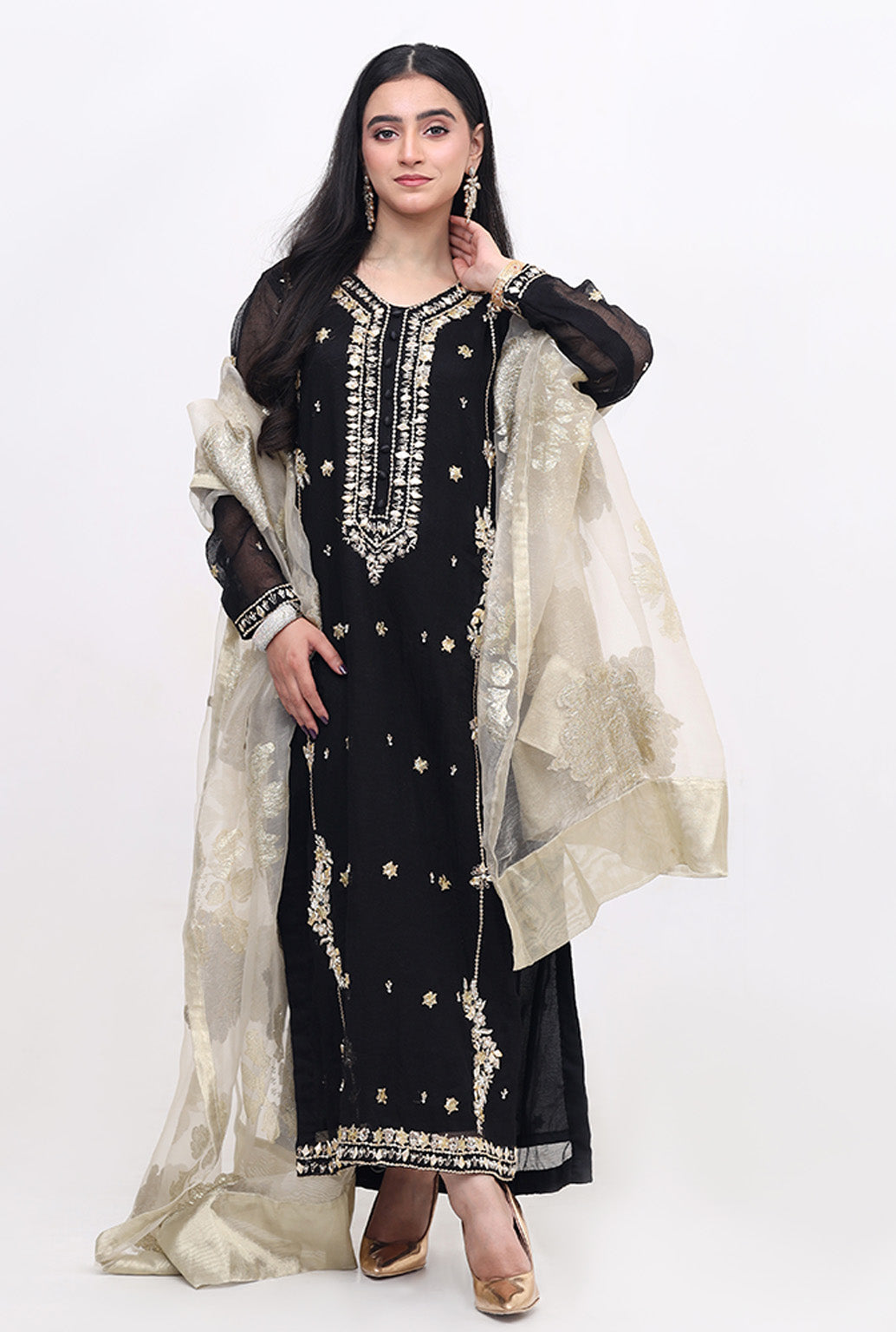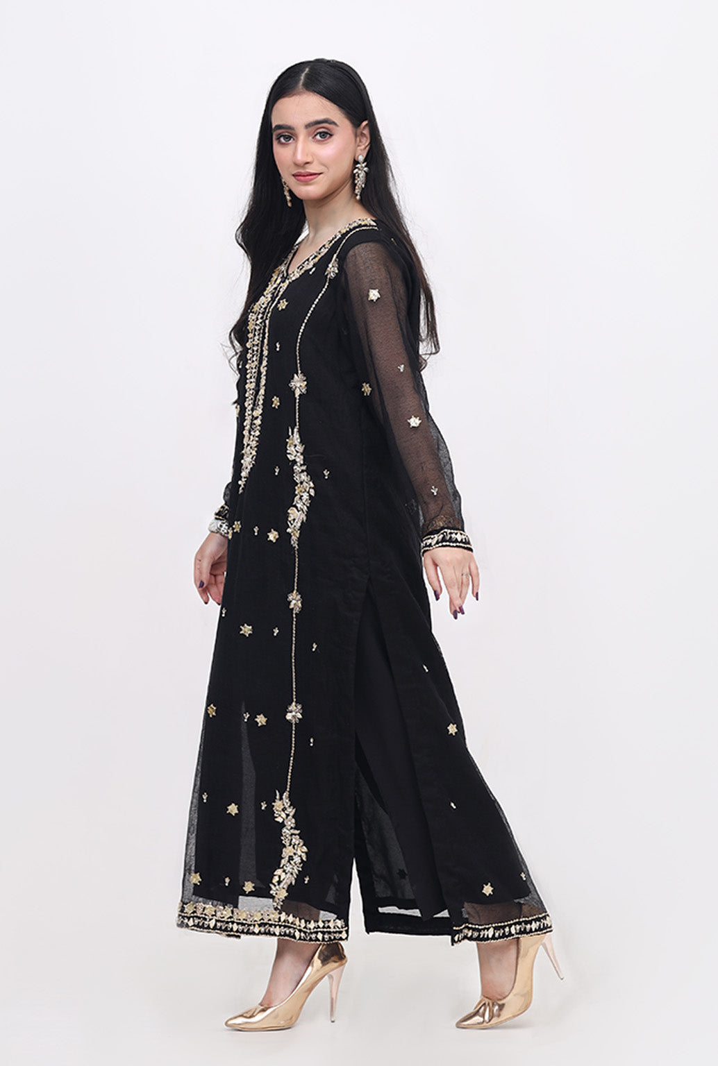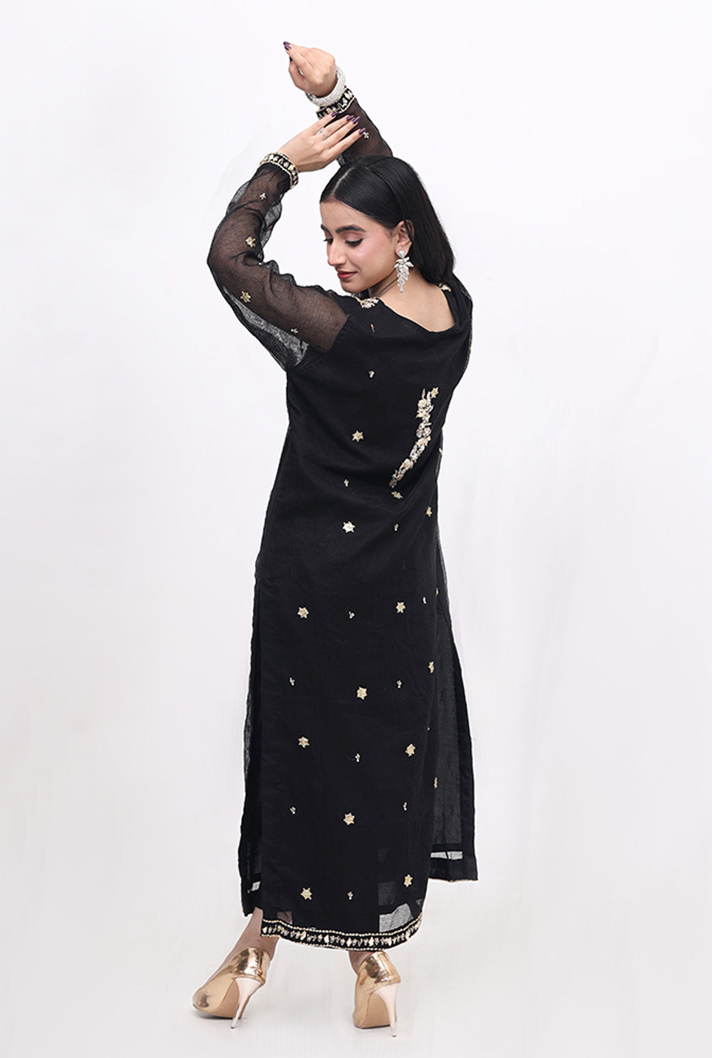 Description : The Dress Features A Long Length Black Tunic With Intricate Gold Embroidery. The Tunic Features Long Sleeves And A Round Neckline, With The Kora Daba And Gota Work By Craft Manship Concentrated Around The Neckline And Hem. The Dress Is Made Of A Lightweight Material, On Cotton Net , And Has A Flowing Design That Drapes Elegantly On The Body.