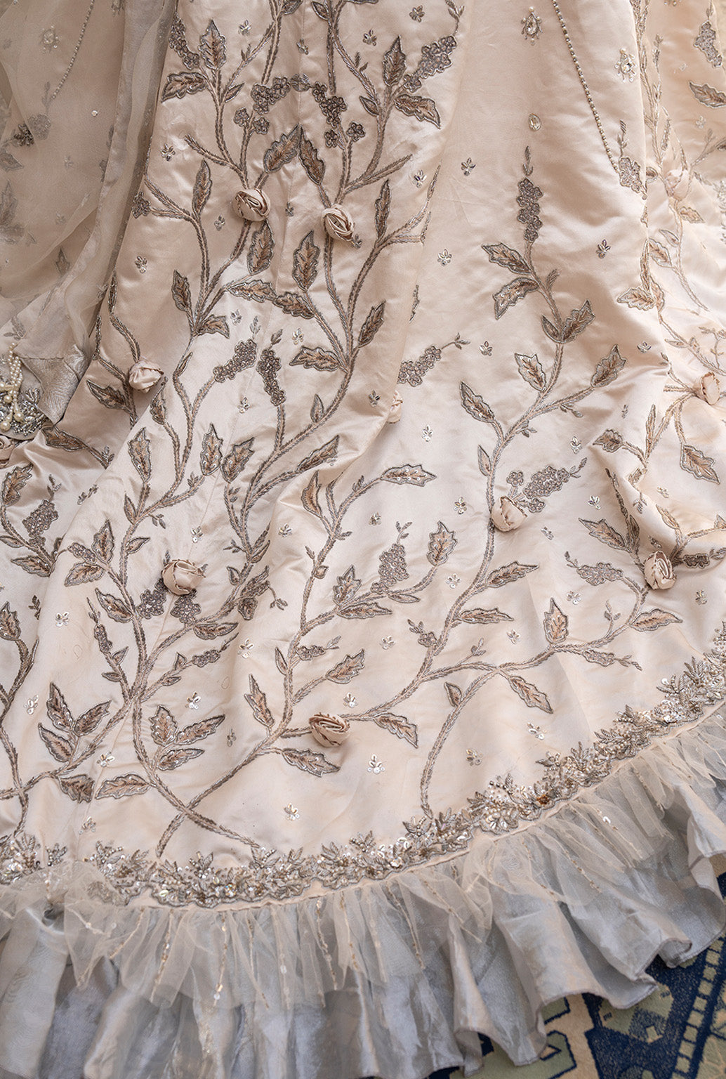 Description: A Timeless Ivory Colored Bridal Ensemble Crafted With Finesse — A Satin Silk Long Flared Lehnga Paired With A Pure Atlas-Jamawarcholi And Four Sided Four Inches Border Adorned With Intricate Hand Embellishments Featuring Kora, Dabka, Naqshi, Pearls, And Sitara Work. Delicate Handmade Fabric Flowers Are Patched On The Lehnga, Adding A Romantic Finish To This Regal Silhouette