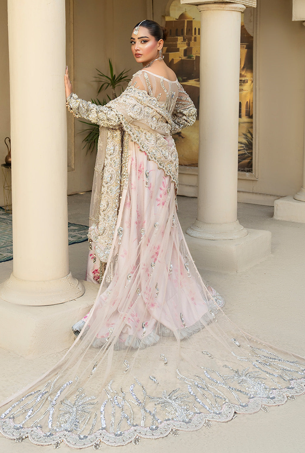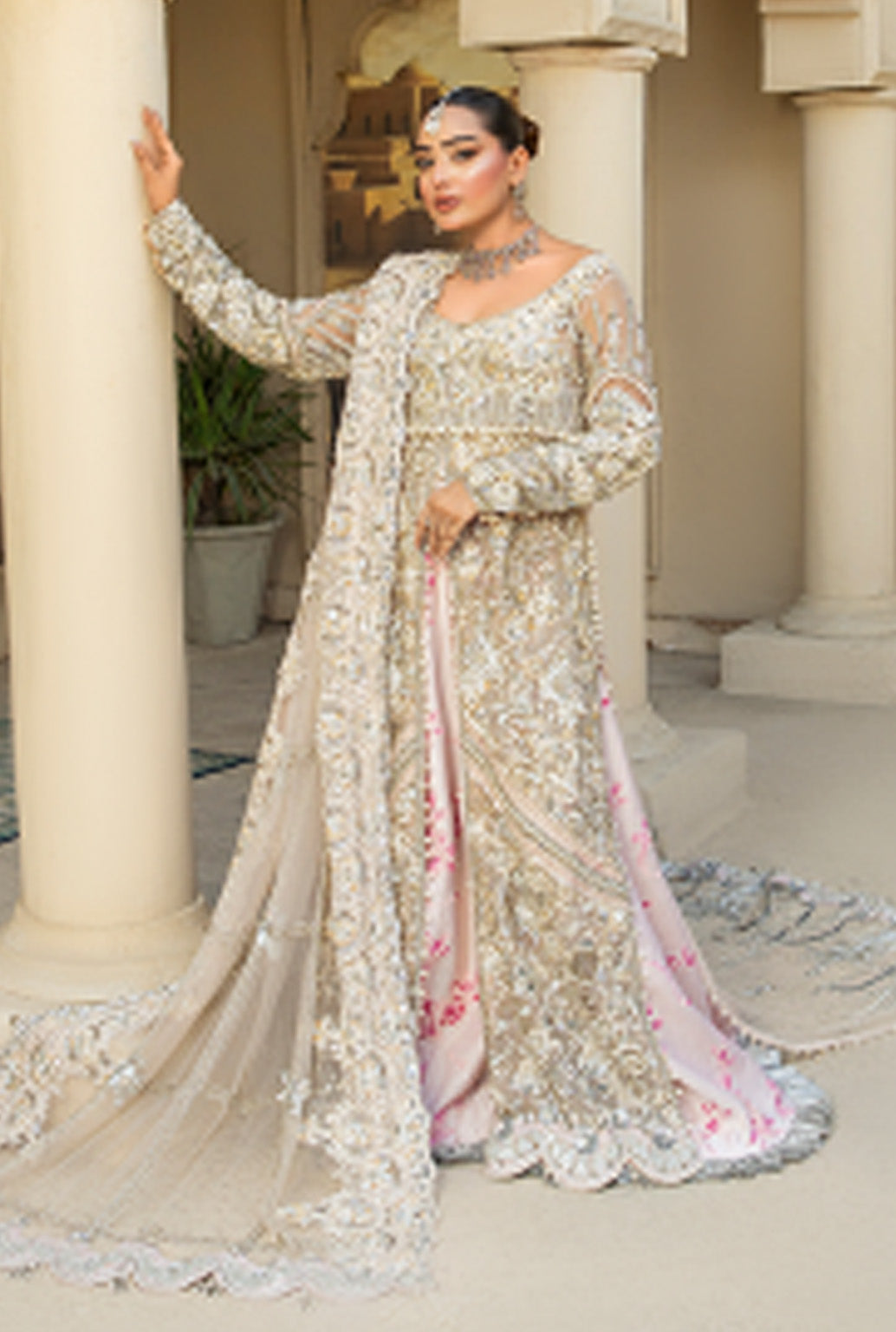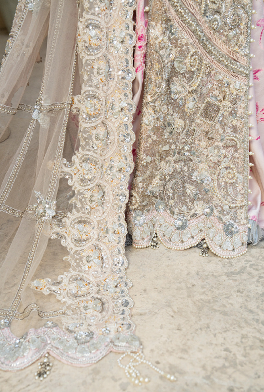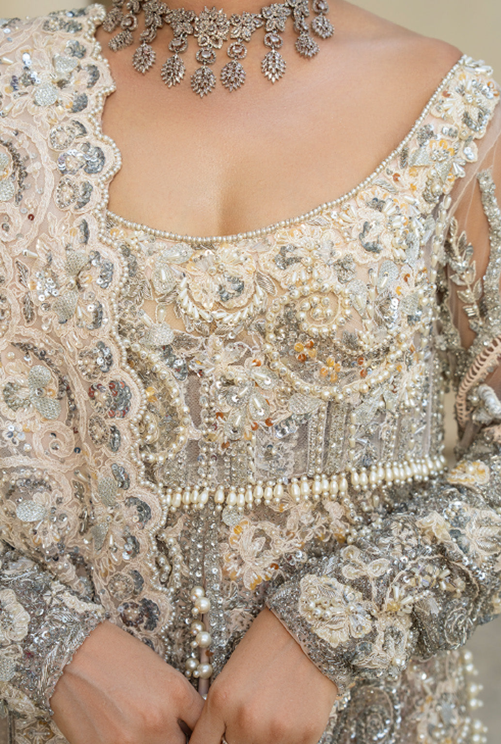 Description: This Product Handcrafted Stylish Bridal Long Tail Open Cuts Mexi With Embrioded Leghna Outfit Featuring Delicate Embroidery On A Soft Ivory Base With Blush Pink Accents. Designed With Intricate Handwork Of Silver Kora Dabka Pearls, Sequins, And Crystals, This Elegant Ensemble Includes A Richly Embroidered Dupatta With 7 Inches Border Work And A Graceful Silhouette.