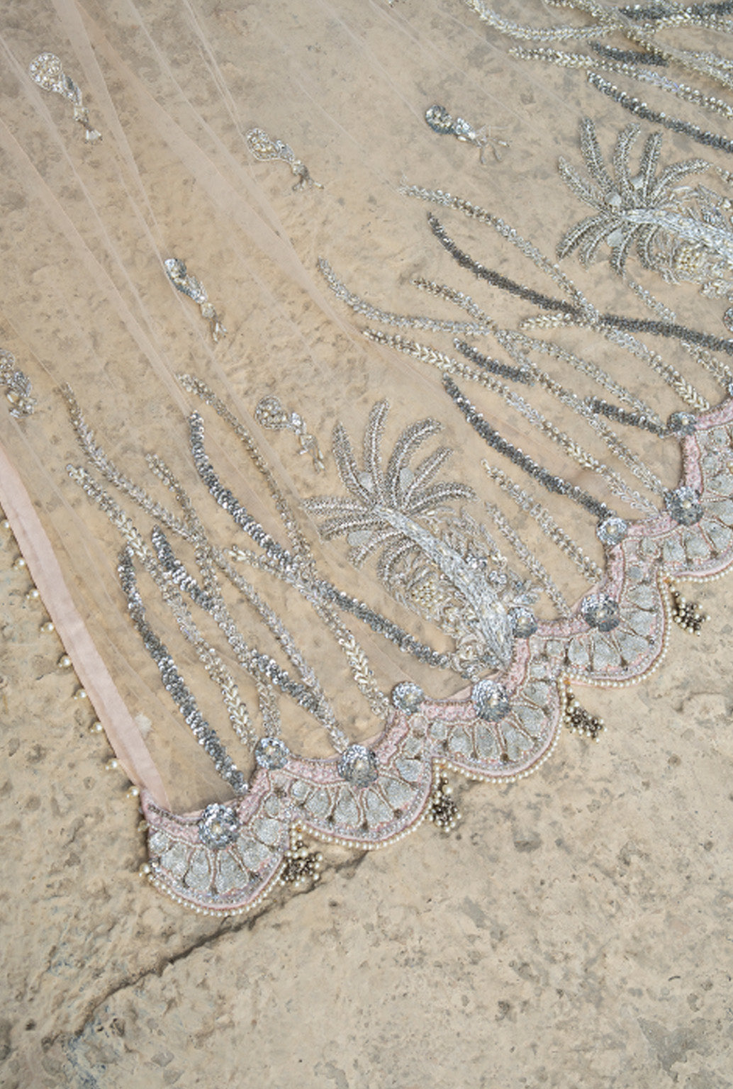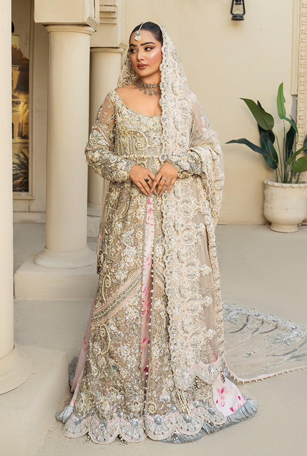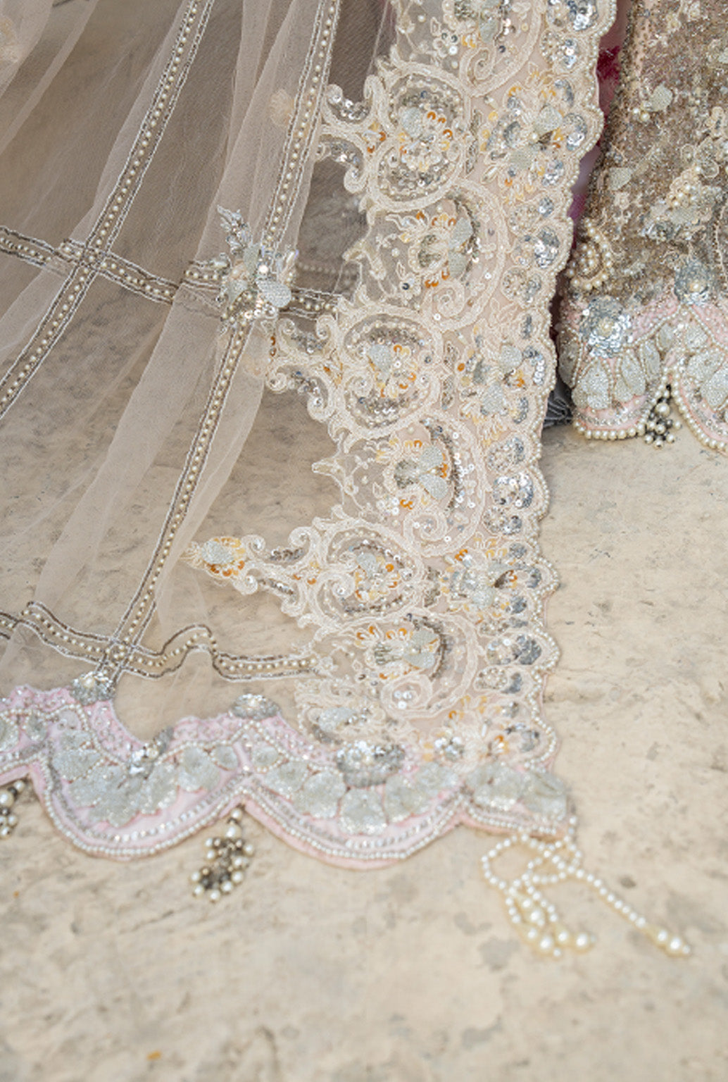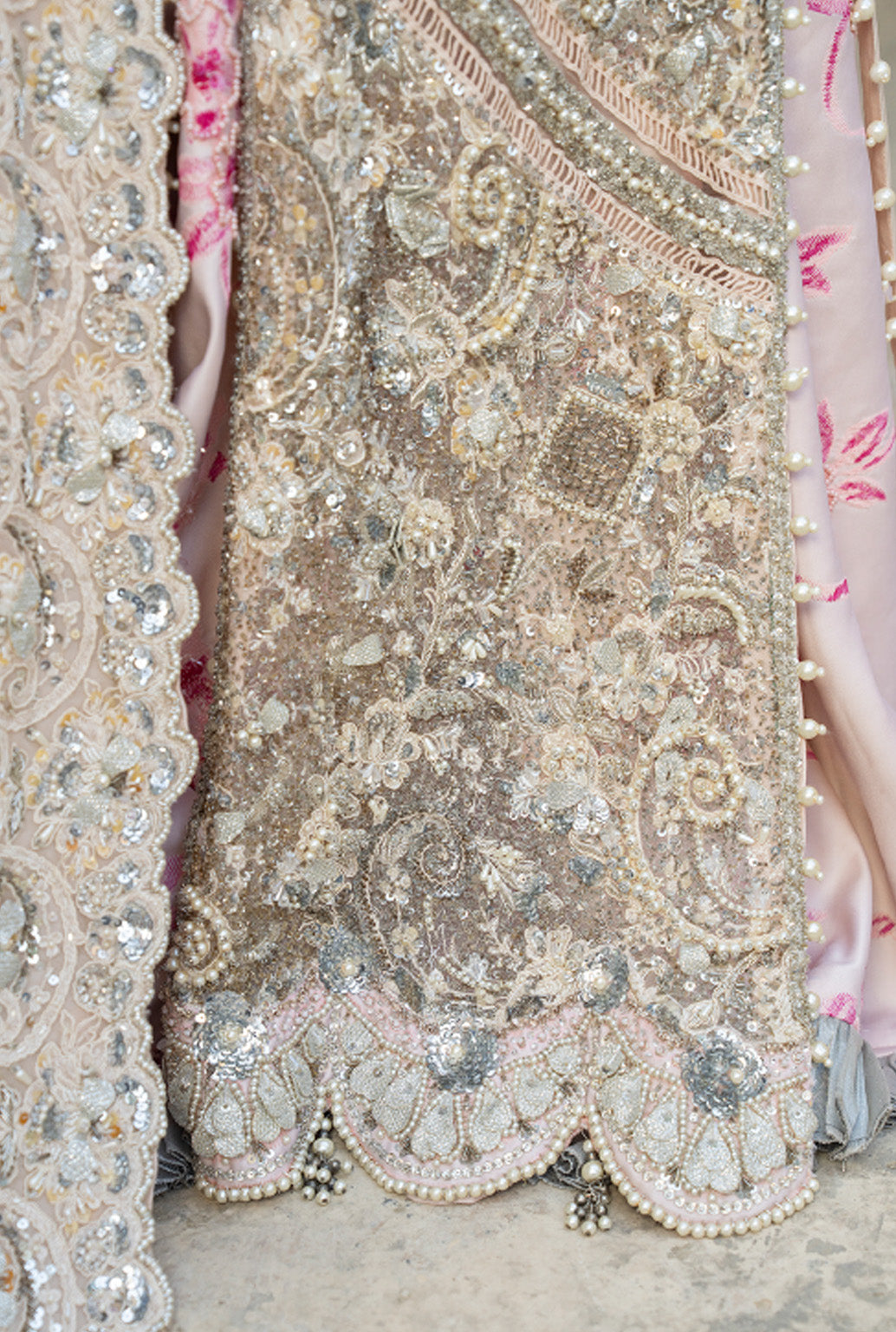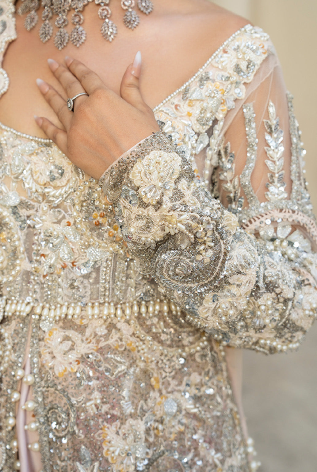 Description: This Product Handcrafted Stylish Bridal Long Tail Open Cuts Mexi With Embrioded Leghna Outfit Featuring Delicate Embroidery On A Soft Ivory Base With Blush Pink Accents. Designed With Intricate Handwork Of Silver Kora Dabka Pearls, Sequins, And Crystals, This Elegant Ensemble Includes A Richly Embroidered Dupatta With 7 Inches Border Work And A Graceful Silhouette.